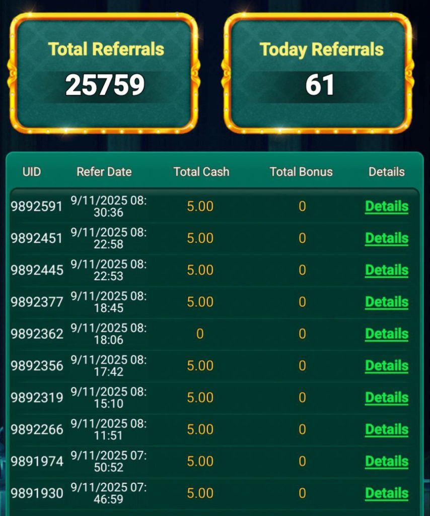 Free Cash Bonus को Claim करने के लिए आपको इस Game को अधिक से अधिक लोगों को अपना Referral Link शेयर करना होगा तभी आपका Free cash Bonus Complete होगा और आप इसको withdrawal कर सकते हैं |